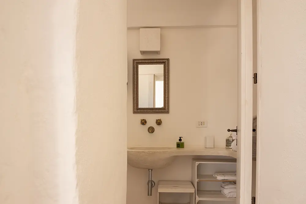 Situata al livello rialzato rispetto ai giardini, l'elegante Dimora Padronale si sviluppa e prende vita nell’antico corpo principale della masseria. Composta da più ambienti ampi e luminosi, scanditi da soffitti voltati, cementine d’epoca e pareti intonacate a calce come da tradizione pugliese, la Dimora Padronale si estende per circa 90 mq: salendo la scalinata e attraversando la terrazza vista mare della dimora, la zona pranzo si integra armoniosamente con una cucina completamente accessoriata, perfetta per pranzi e cene in compagnia, lasciando spazio ad un’accogliente area living e ad un intimo angolo conversazione in alcova, con caminetto e poltroncine. La zona notte si compone di 2 camere matrimoniali, ognuna dotata di letto king-size, comodo materasso e doppio cuscino, per garantire il miglior riposo. Un’ampia sala da bagno, completa gli ambienti interni della Dimora Padronale.